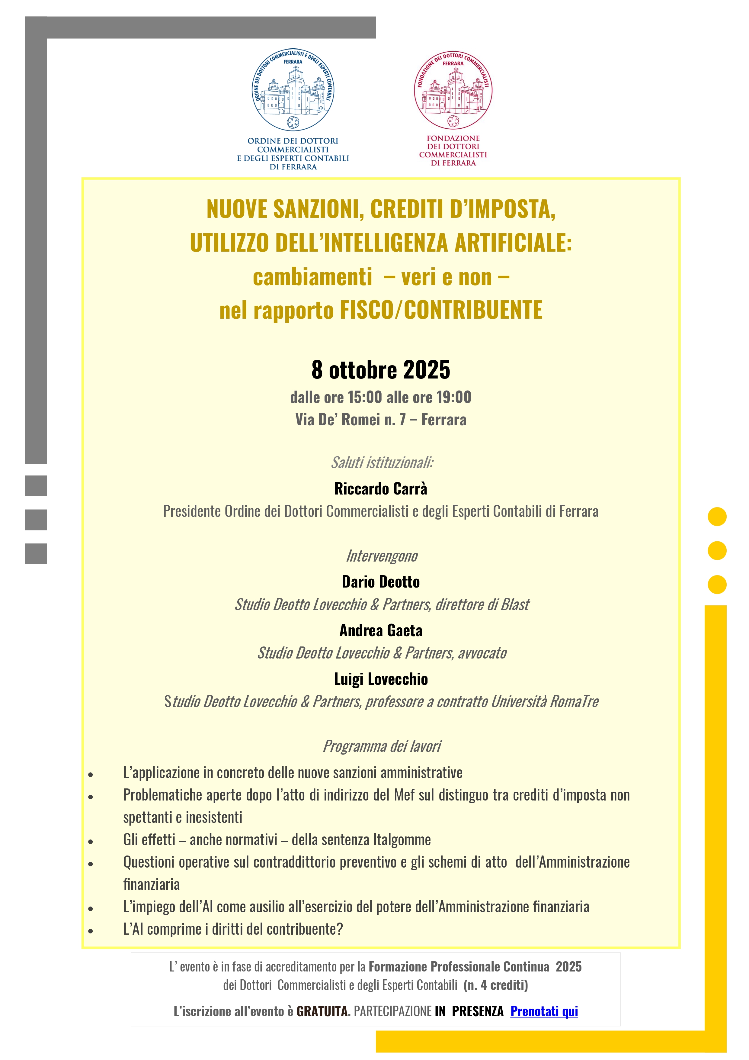 L'Avvocato Andrea Gaeta ha illustrato nel dettaglio i profili sostanziali e procedimentali dello schema di atto di cui all'articolo 6-bis dello Statuto dei diritti del contribuente, occupandosi, tra l'altro, di casi di esclusione, conseguenze sui termini di accertamento, scelta tra istanza di accertamento con adesione e osservazioni/controdeduzioni e rapporti con il ravvedimento operoso.